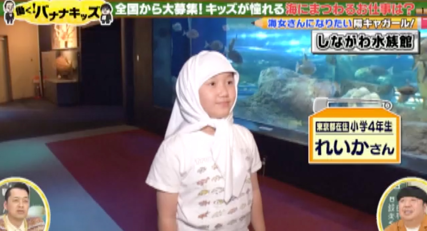 れいかさん「海女さんになりたい!」 最初に出てきたのは、独特の格好をしたれいかさん。将来やってみたいお仕事は…?海に潜ってアワビやサザエなどを獲る “海女さん”。「海女さんが着ている磯着が通販で売ってなくて…」と、帽子だけイメージしてきました。