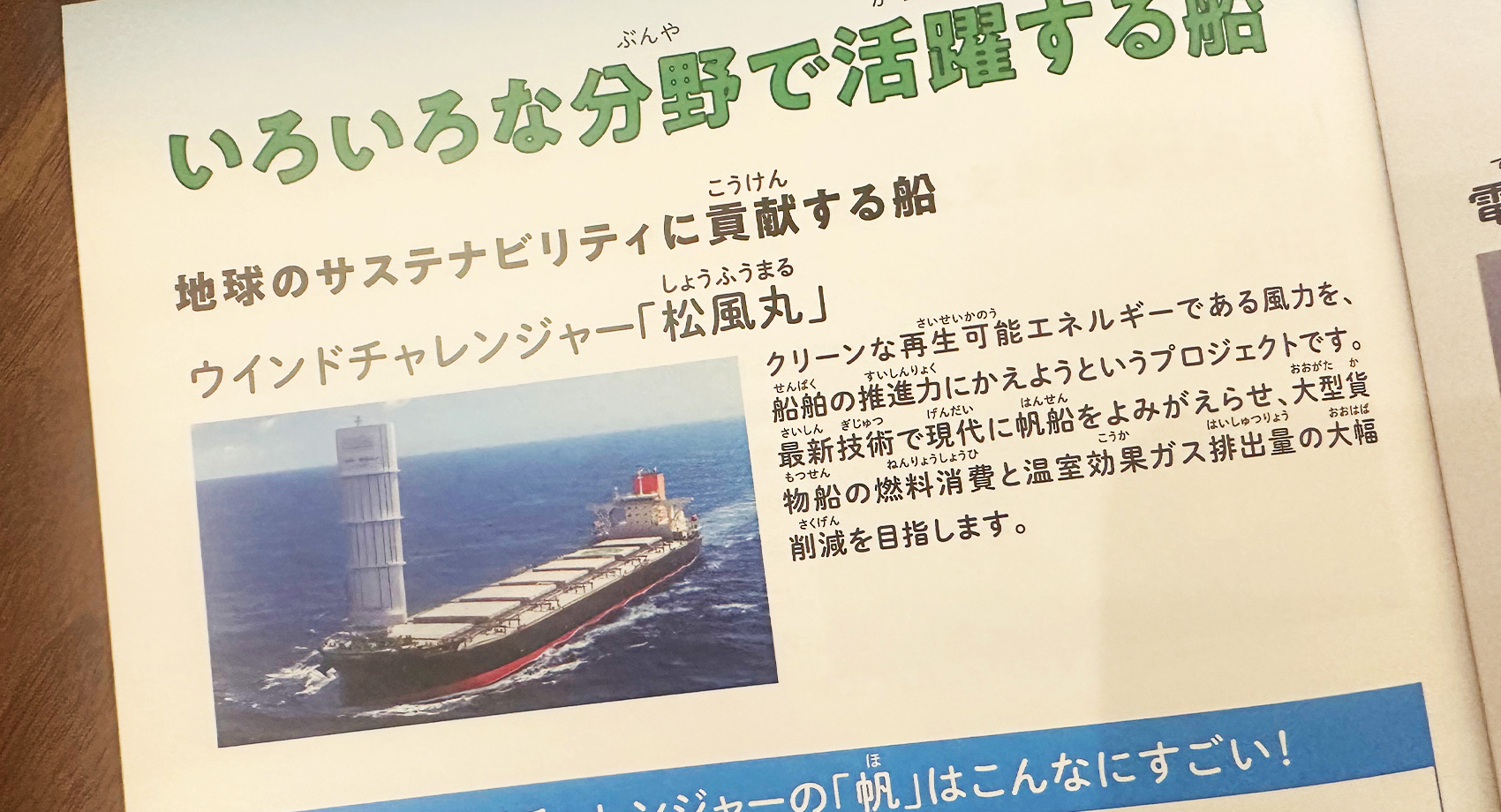 実はウインドチャレンジャープロジェクトという風力補助推進システムは、2022年より既に運用中。(写真は商船三井お仕事探求Book)