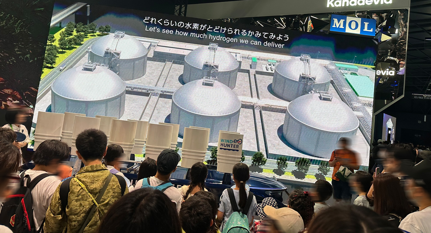 ブースではうちわが配布され、皆んなで風を送る体験もしました。風を送るとシミュレーション航海が始まり、模型の帆が拡縮・回転して発電から水素を生産、供給する仕組みを学べます。実現が楽しみですね。