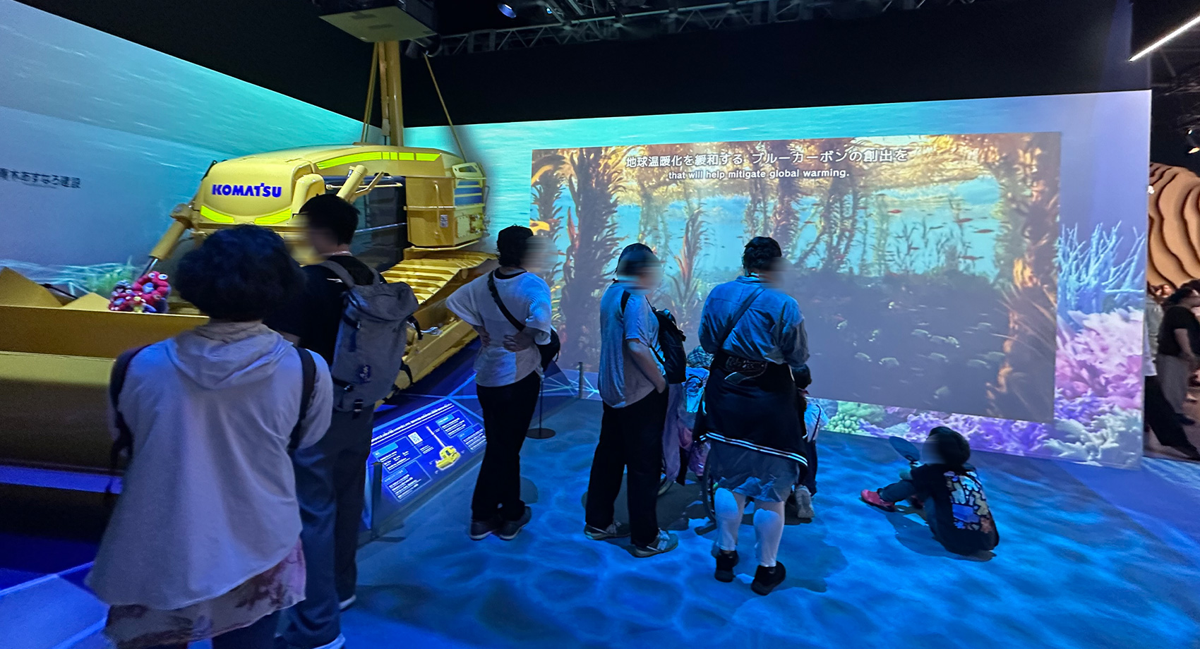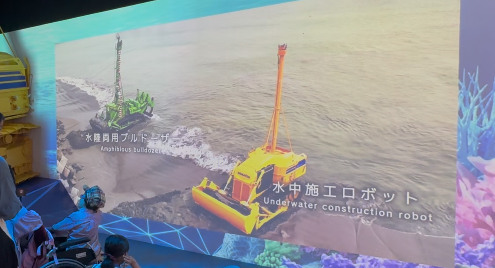 入口の床には足跡を水中施工ロボットが追いかける演出もあり、子ども達が喜んでいました。海を守り海と共存するための水中施工ロボット。未来の活躍が楽しみですね。