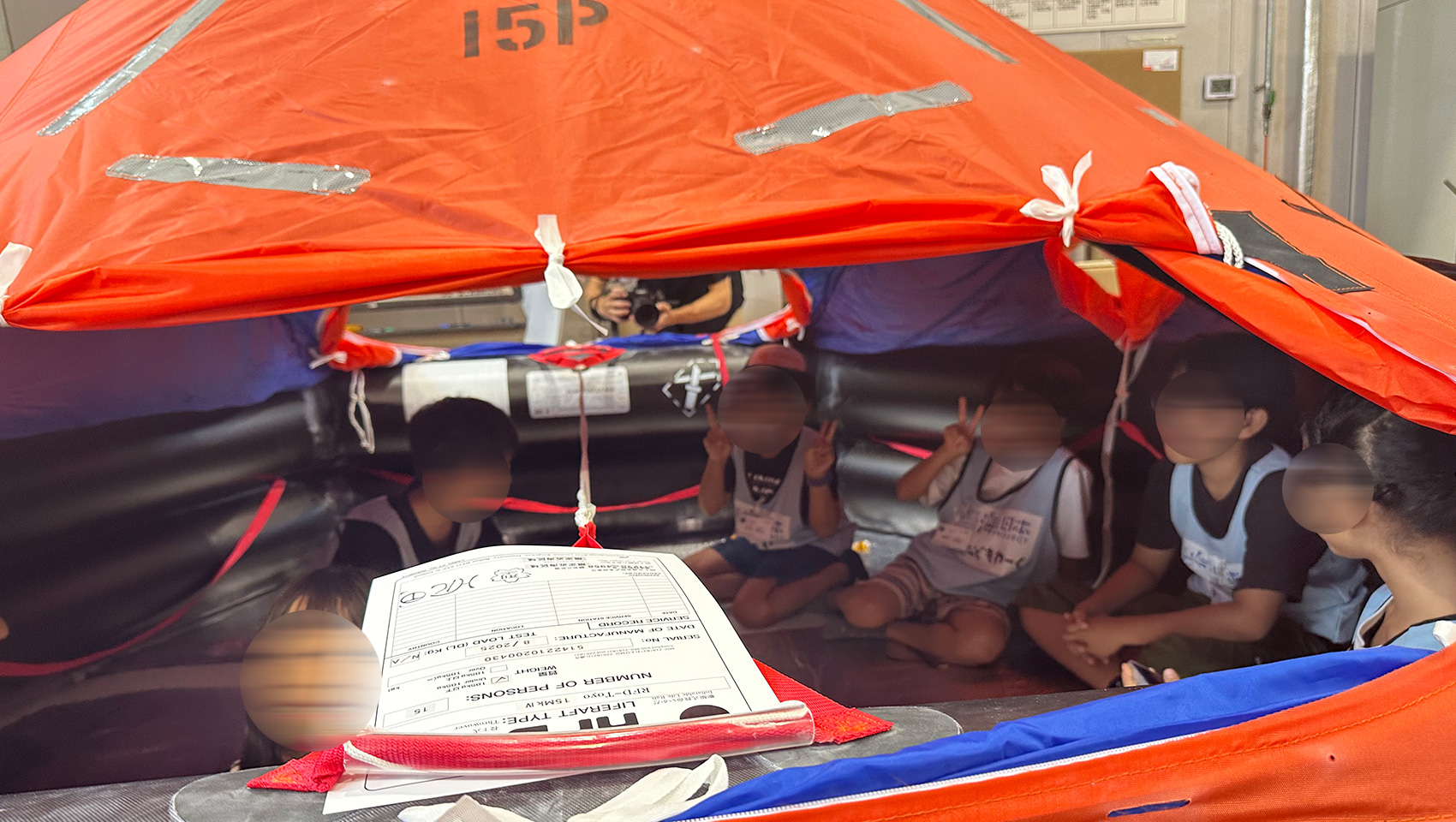 その次は、いかだを膨らませる検品!紐をひくと…ぼん!という大きめな音がして、約20秒ほどで膨らみ、救命いかだになりました!これには大人もびっくり。いかだのてっぺんにはライトが点灯します。頑丈なテントになっていて大波や雨でも中に水が入ってきません。