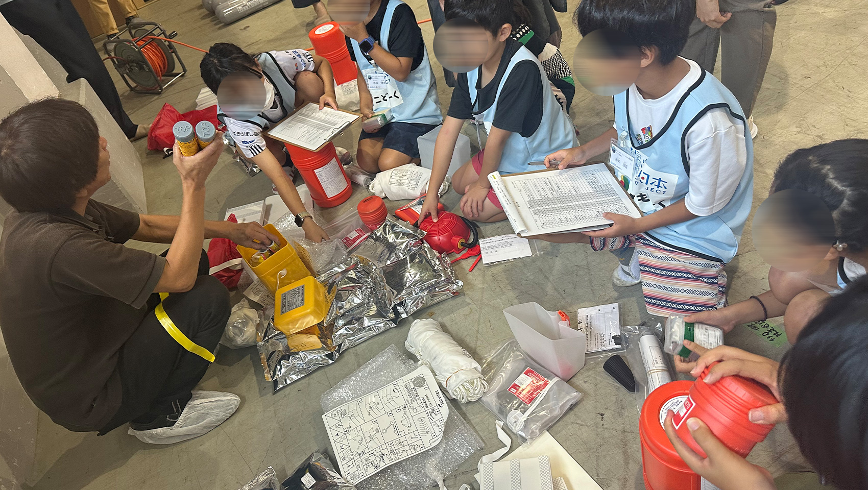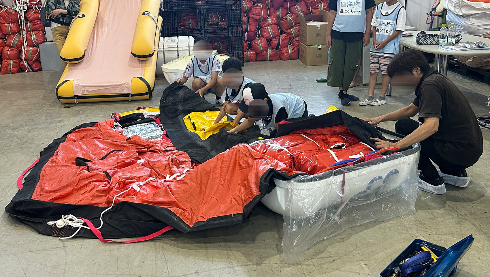 次は、救命いかだに積む非常用セットの確認。救難食料や救命水のほか、SOS用の海面着色剤や発煙等、レーダー反射器、釣り道具などが入っているそう。「これは何ですか?」「どうやって使うのですか?」と、子どもたちの質問が飛び交っていました。