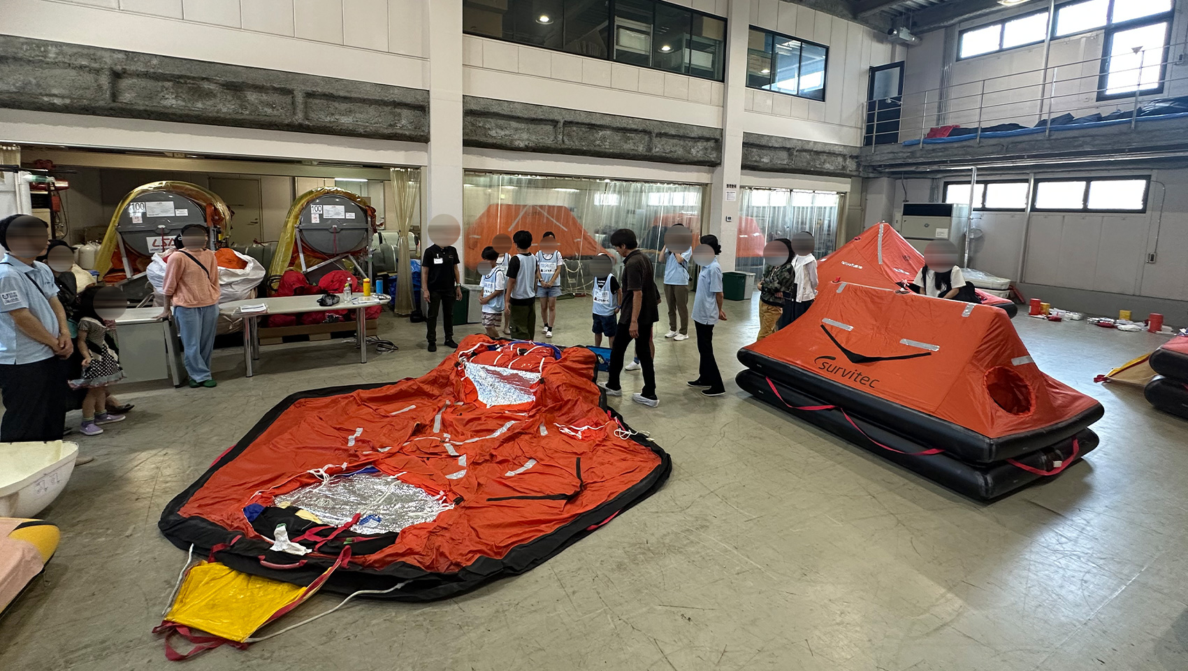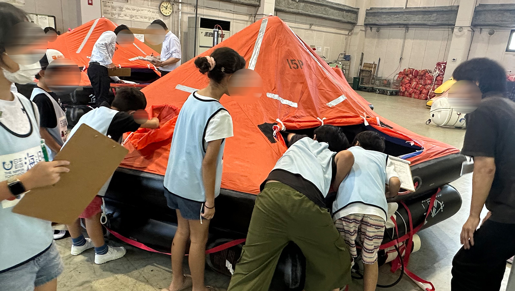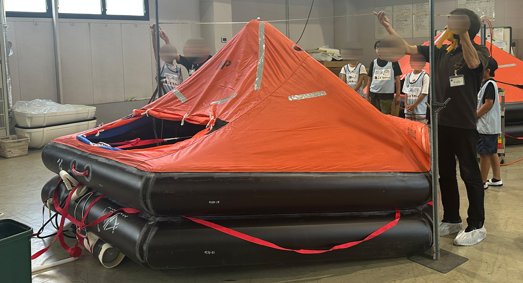 さて、座学が終わると2チームに分かれ救命いかだの検品ルームへ!テントのような形の救命いかだが、大型から小型まであちこちに並び、実際のお仕事風景も見ることができました。