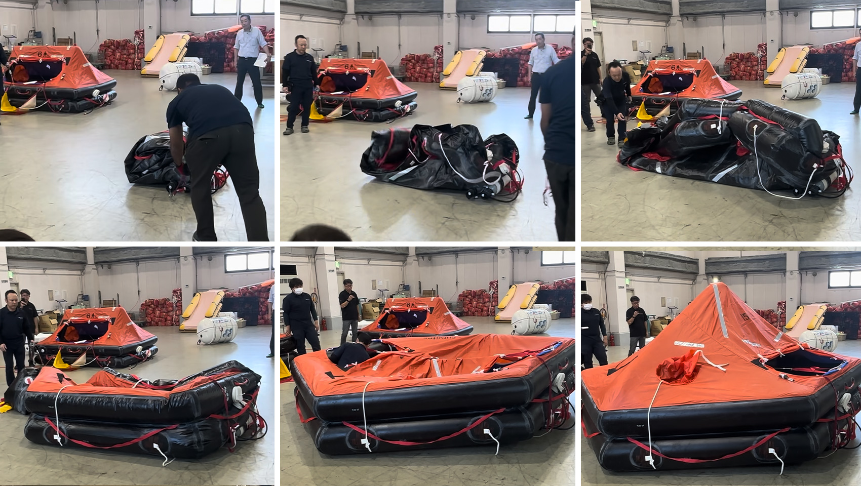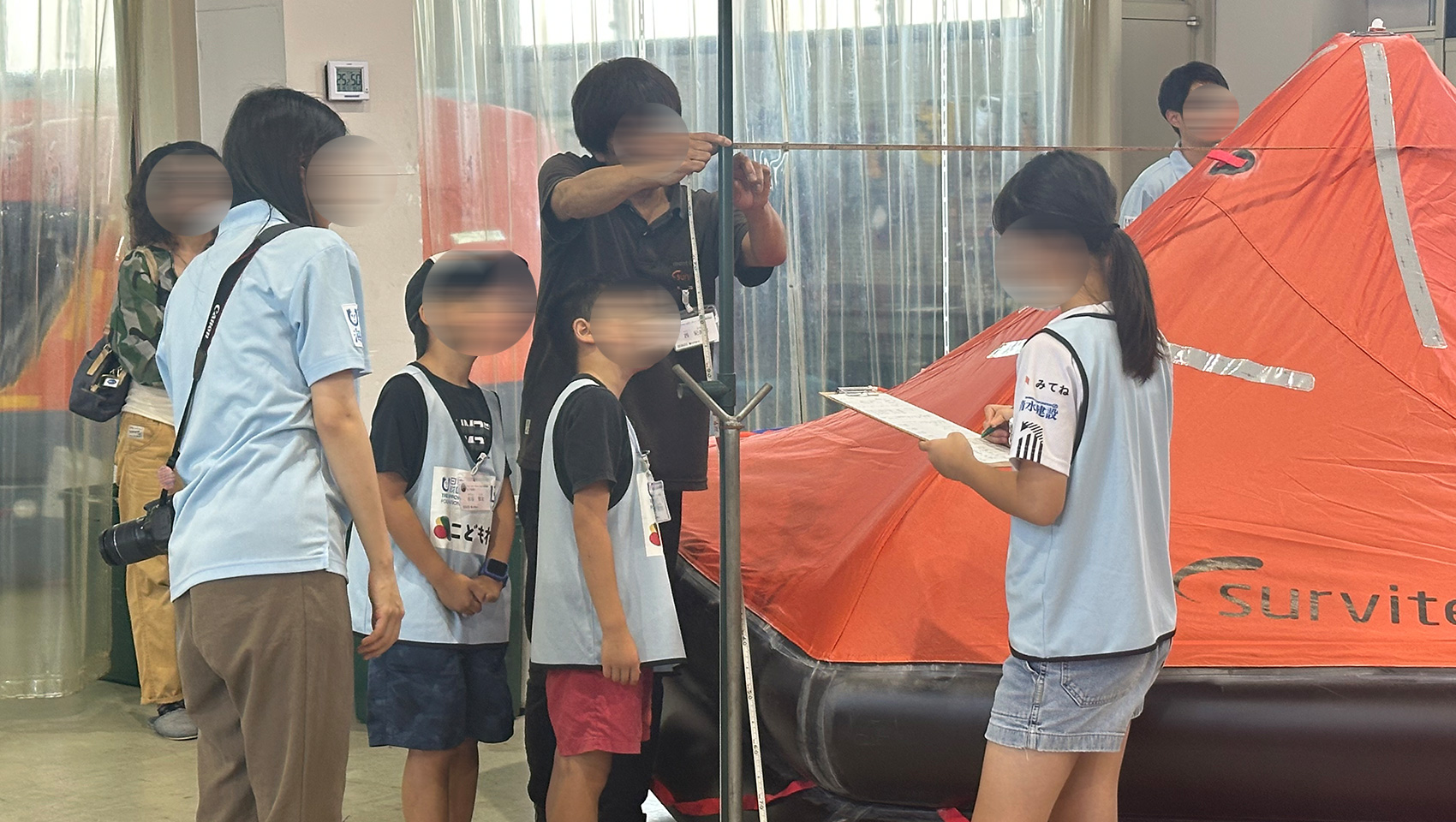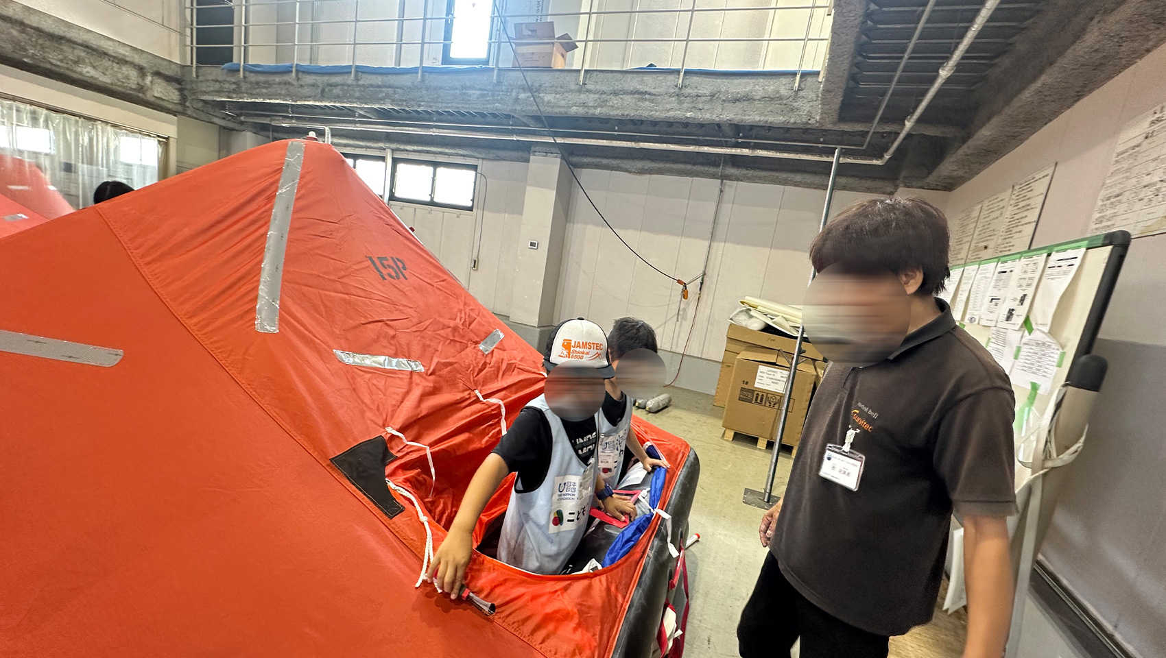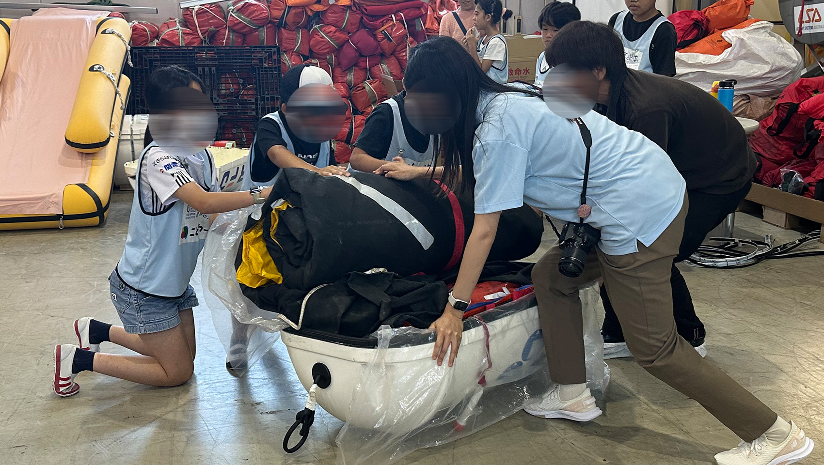 さて、座学が終わると2チームに分かれ救命いかだの検品ルームへ!テントのような形の救命いかだが、大型から小型まであちこちに並び、実際のお仕事風景も見ることができました。