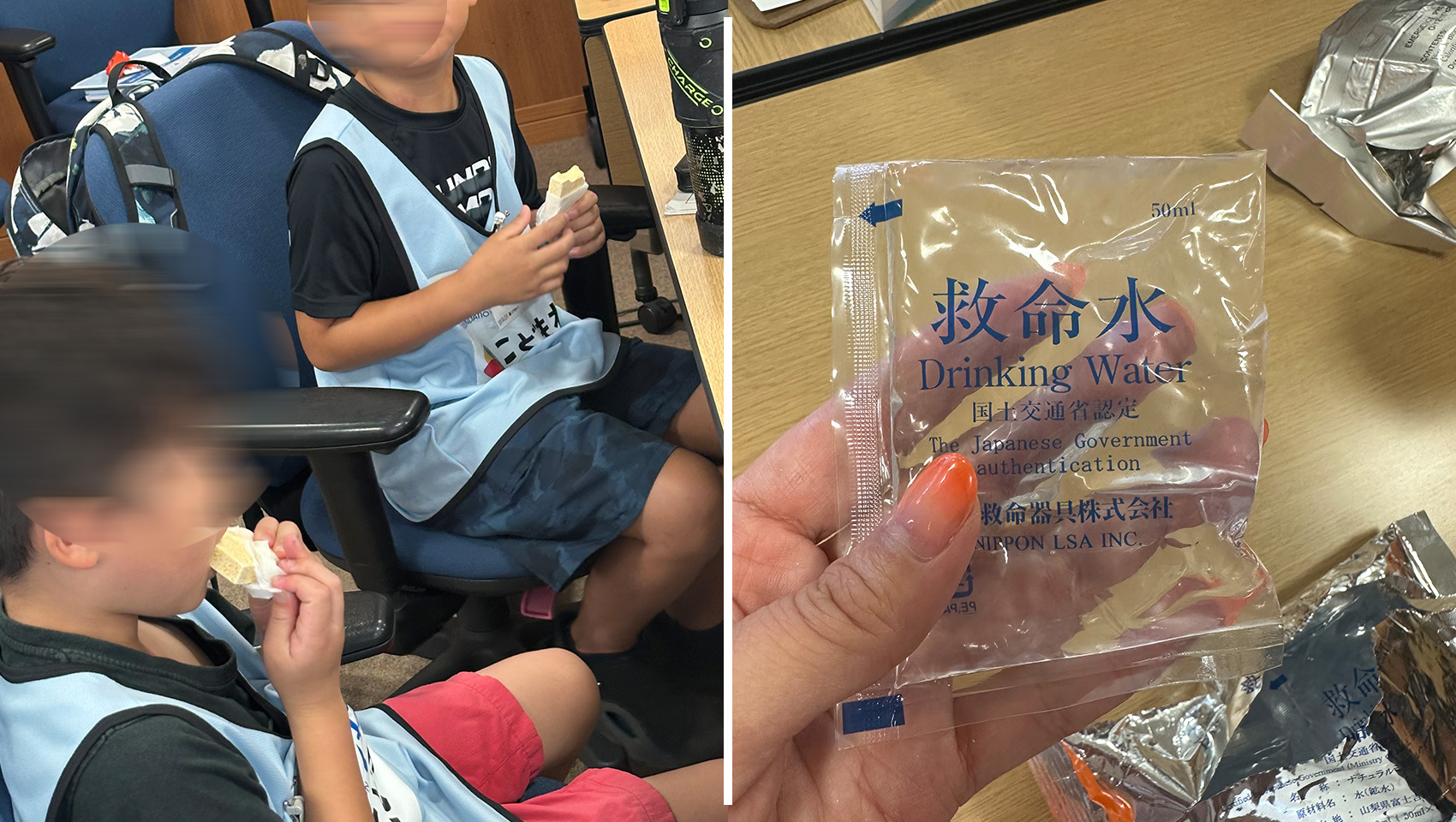 会議室に戻ると、今度は救難食料の試食!固形石鹸のような形でめちゃくちゃ硬いです。お味は…んー。不味くはないけれど美味しくもない。実は美味しいと一気に食べてしまうため、“そこそこの味”にしているのだそう。しかしお腹が空き始めたこどもたちは皆んな「美味しい!」とかぶり付いていましたw 積載物を極力減らすため、救難食料も救命水も必要最低限なのだそうです。(近海か遠洋か等、船によって艤装品や量は異なります)