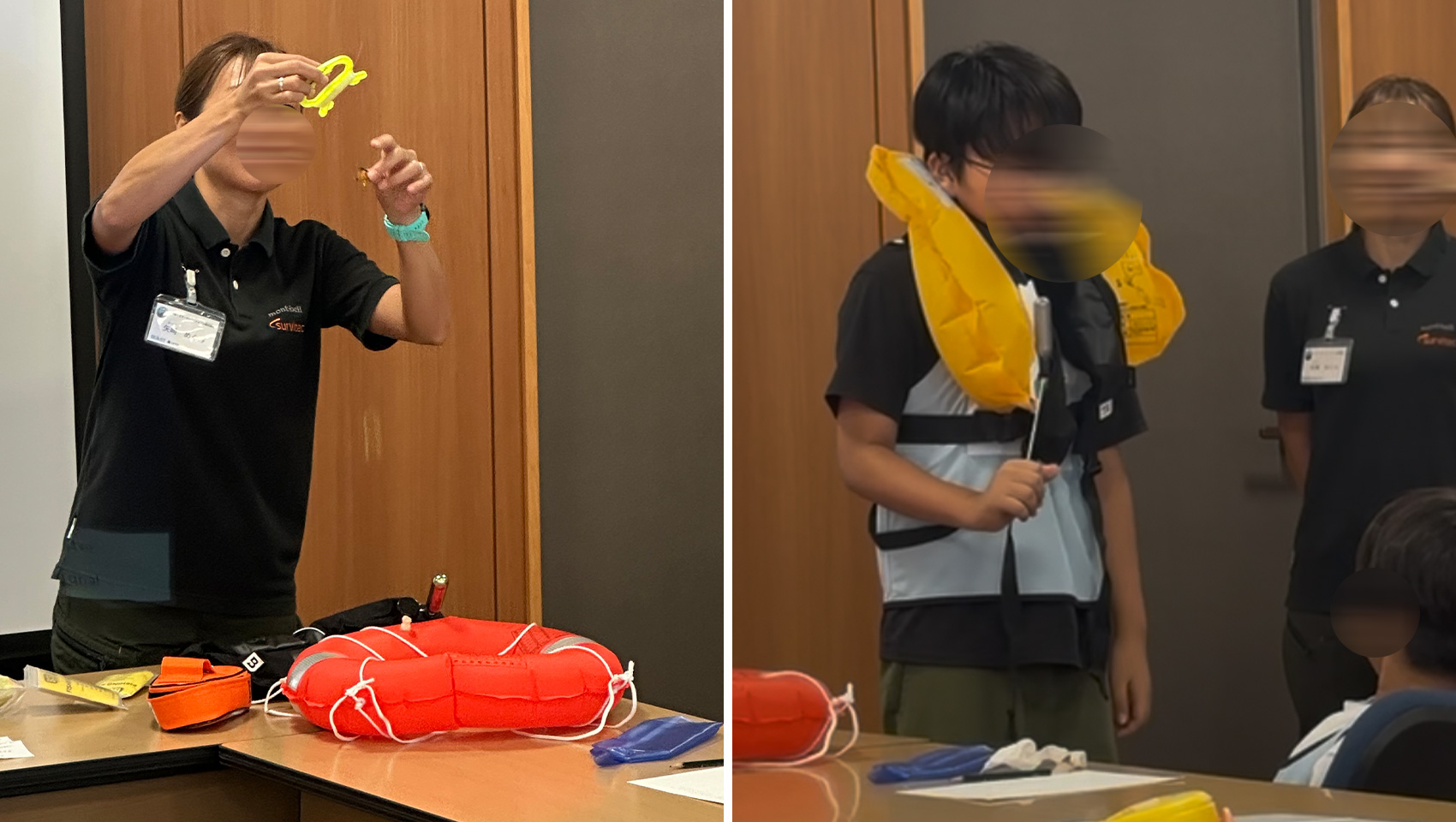 さらに、救命浮き輪や釣具の説明、救命胴衣を膨らます体験、救命グッツに入っている「生存指導書」「行動指導書」も見せてもらいました。生存指導書の1ページ目には「望みを捨てるな。救助は必ずやってくる。」と書かれ、怪我の手当方法や生き抜く術、「海は不毛の砂漠ではない。魚肉の50〜80%は真水である。」というような文面も。また、実際に1日漂流テストをしたお話を聞いたりと、引率した親も楽しいお仕事体験でした。