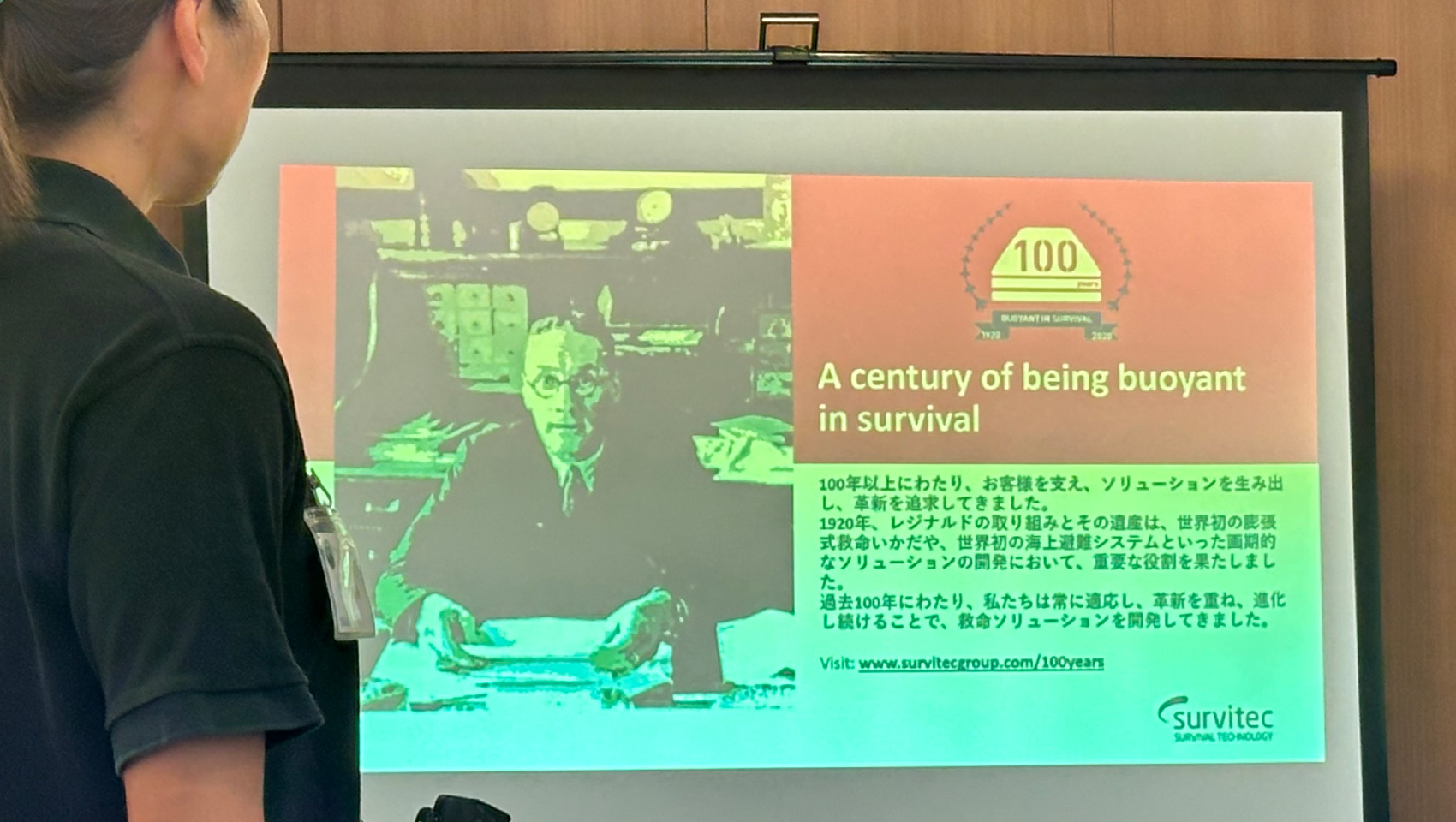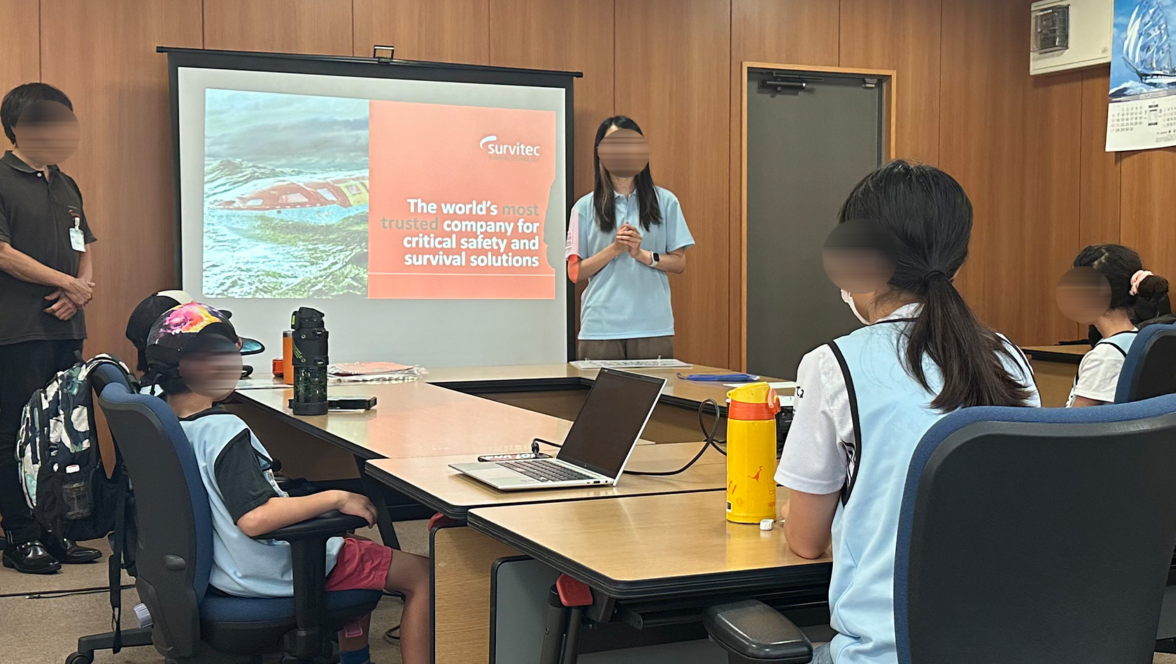さて、お仕事体験当日は会議室での座学からスタート。海のお仕事体験について、海と日本プロジェクトの活動、救命いかだの歴史や重要性などを、映像を見ながら学びます。